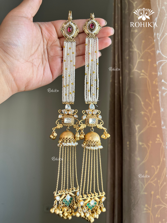 Piya polki jhumka earrings with earchains(EE-005)- Dark green and Ruby Red