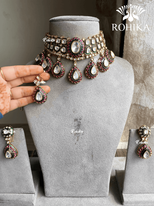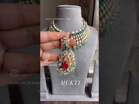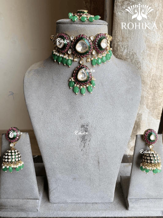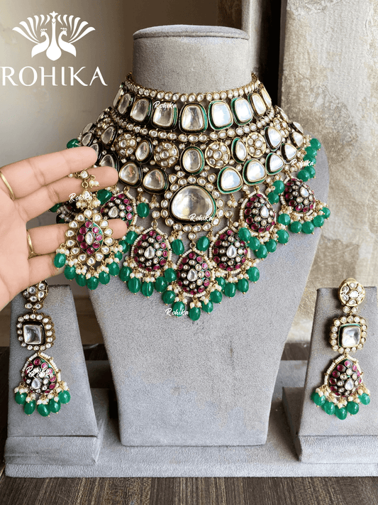 Netra bikaneri polki kundan bridal necklace set - Dark green & pink