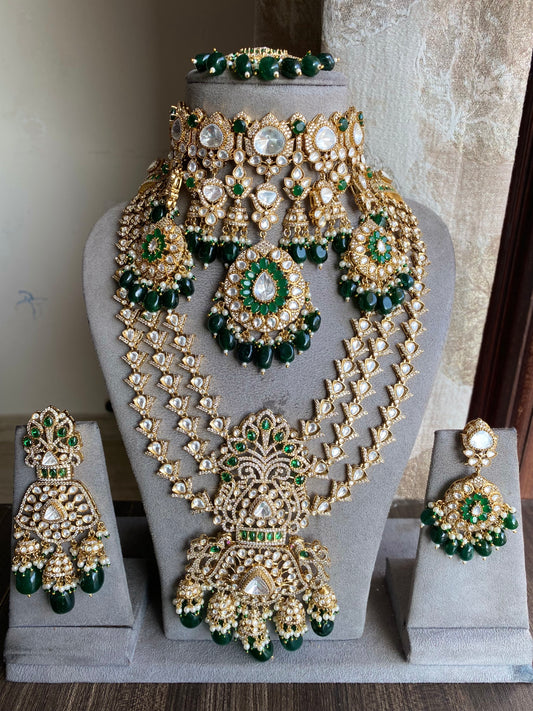Vajasi bikaneri polki kundan bridal combo set - Dark Green & pink