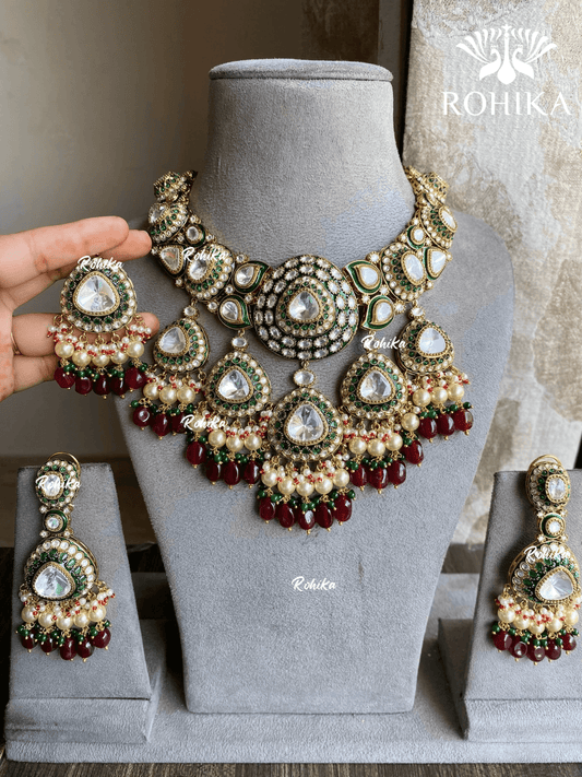 Pragati Bikaneri Polki Kundan Necklace Set - Green & Red