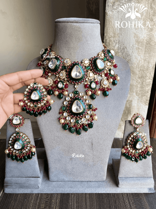 Vayu bikaneri polki kundan bridal combo set - Dark Green and Ruby red