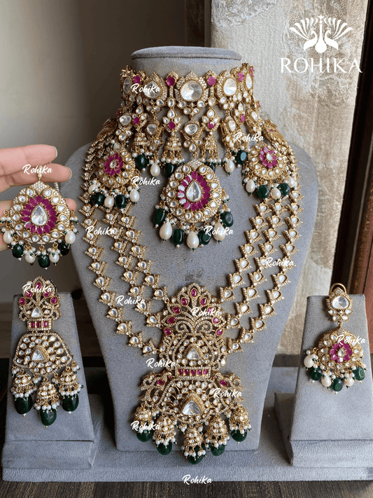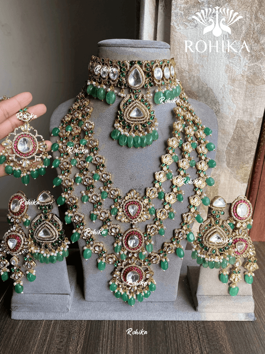 Priksha moisanite polki kundan bridal combo set - Green and Ruby