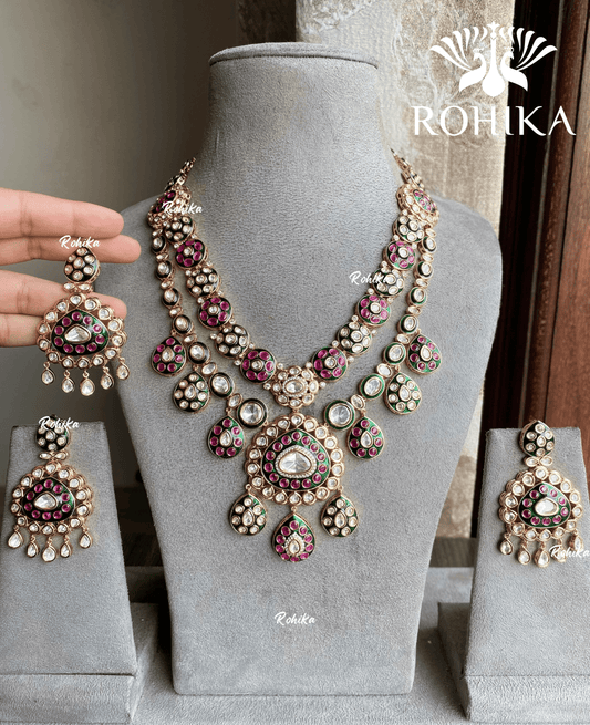 Nirvana Moisanite Polki Necklace Set - Green and Pink