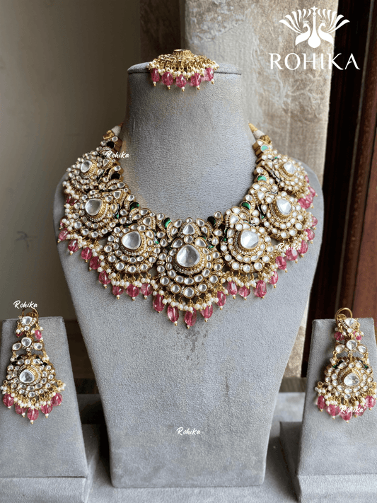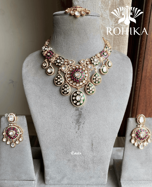Tapasya Moisanite Polki Necklace Set - Green and Pink