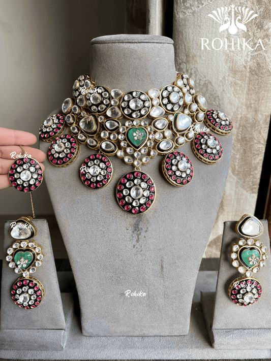 Arshia Moisanite Polki Bridal Combo Set - Green and pink