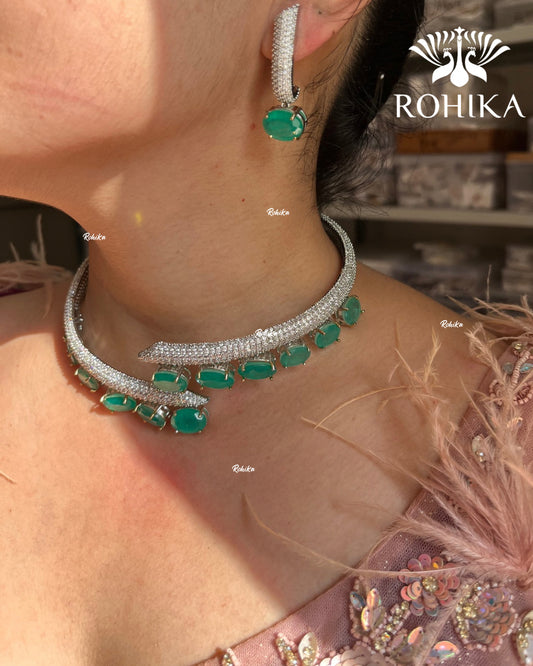 Evelyn American Diamond Hasli Necklace Set - Mint Green
