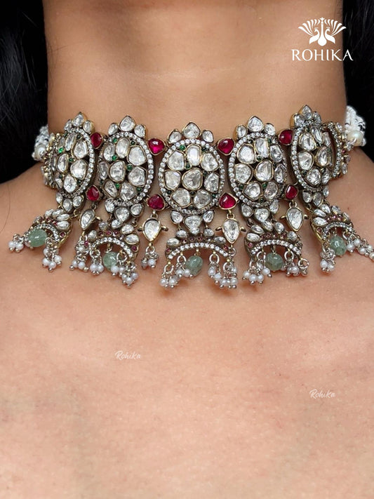 Yamini Moisanite Choker Necklace Set - Ruby & Mint Green