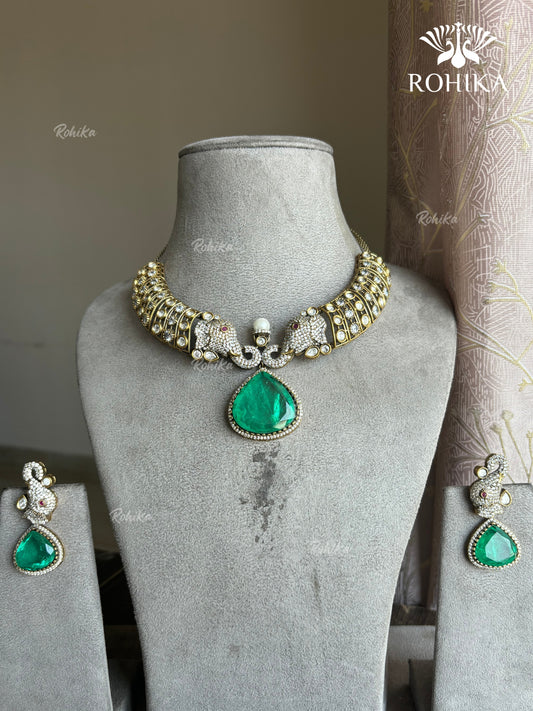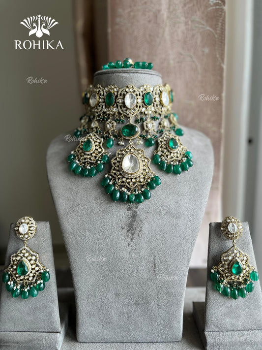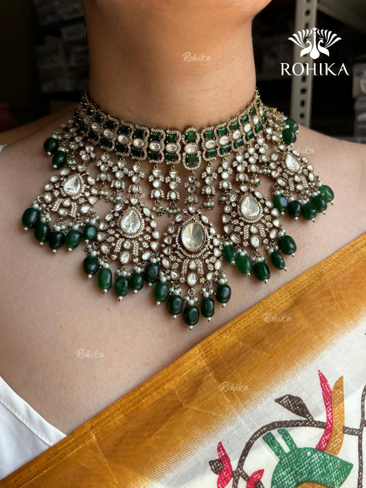 Daivik Moisanite Kundan necklace Set - Dark Green