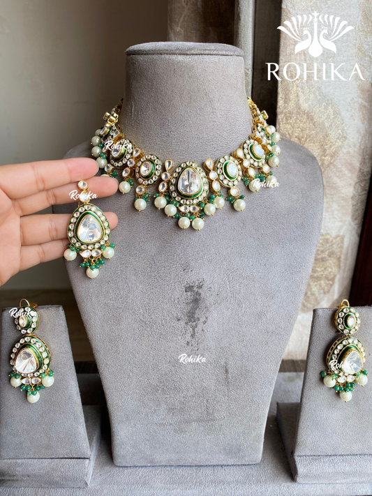 Falak Moisanite Polki Kundan Necklace Set - Green
