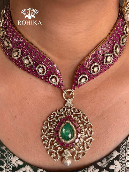 Divyam Moisanite Necklace Combo Set - Dark Green