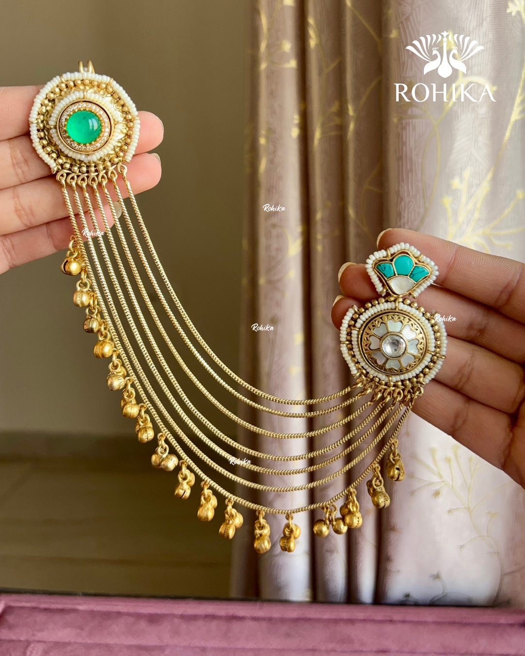 Piya polki kundan earrings with earchains(EE-007)- Mint Green and White